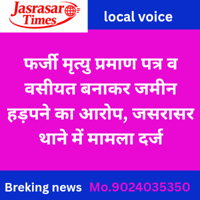 फर्जी मृत्यु प्रमाण पत्र व वसीयत बनाकर जमीन हड़पने का आरोप, जसरासर थाने में मामला दर्ज
